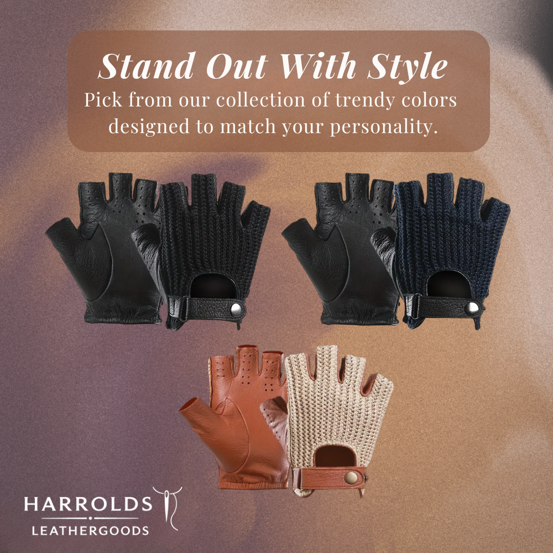 Add a sleek edge to your driving look with these fingerless gloves. The leather finish enhances both durability and style. Perfect for drivers who want function with a fashionable touch.
